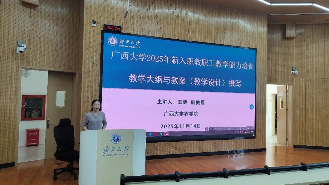 2025年11月14日下午,广西大学教务处组织开展了2025年新入职教师教学能力提升首场培训。旨在帮助新入职教师系统掌握教学基本规范,提升课程设计与教学实施能力。我院教师、广西大学教师发展培训师王博副教授应邀作题为“教学大纲与教案(教学设计)撰写”的专题报告,我校近200名新进教师通过线上或线下的方式参加了培训。