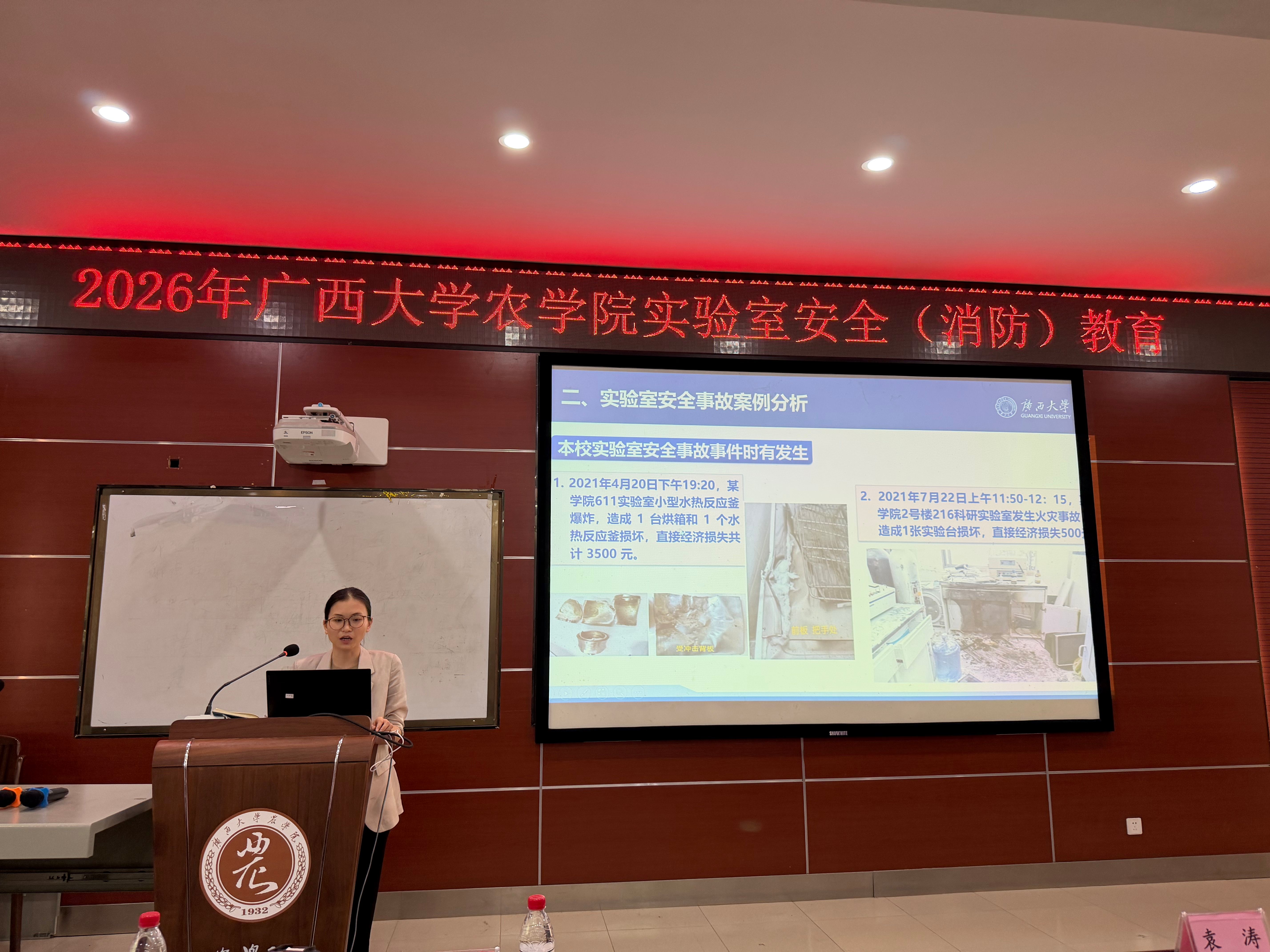 韦燕燕副院长作实验室安全教育报告。她指出,农学院实验室数量居全校首位,覆盖从 I 级重大风险至 IV 级低风险的全等级,涉及化学安全、压力容器等多类危险源,安全管理任务艰巨。她结合校外典型案例以及校内烘箱火情、电路短路起火等消防安全事件,深刻剖析了事故成因与教训,警示全体师生充分认识到违规操作、管理疏漏可能引发的严重后果。她强调,全体师生必须严格遵守实验室安全核心要求,围绕用电安全、危化品存储等关键环节,落实好实验室安全 “十必须十禁止” 准则,规范易燃易爆物品管理、加热设备使用等操作。同时,要熟练掌握火灾、化学品泄漏等突发情况的应急处置流程,正确使用灭火器、灭火毯等消防器材,明晰事故上报、人员疏散的具体要求,切实提升消防安全实操技能,将安全规范落到实验操作的每一步。