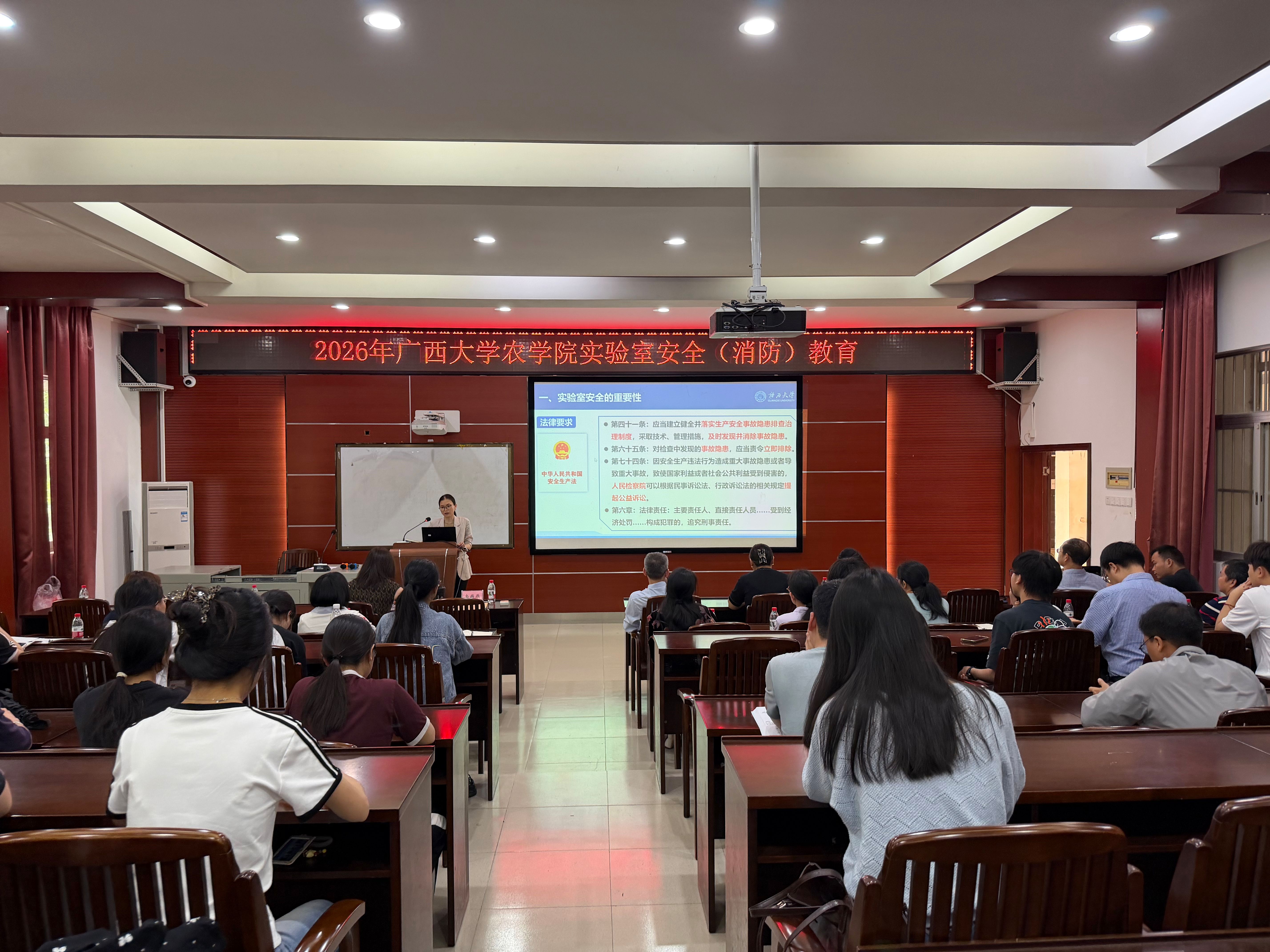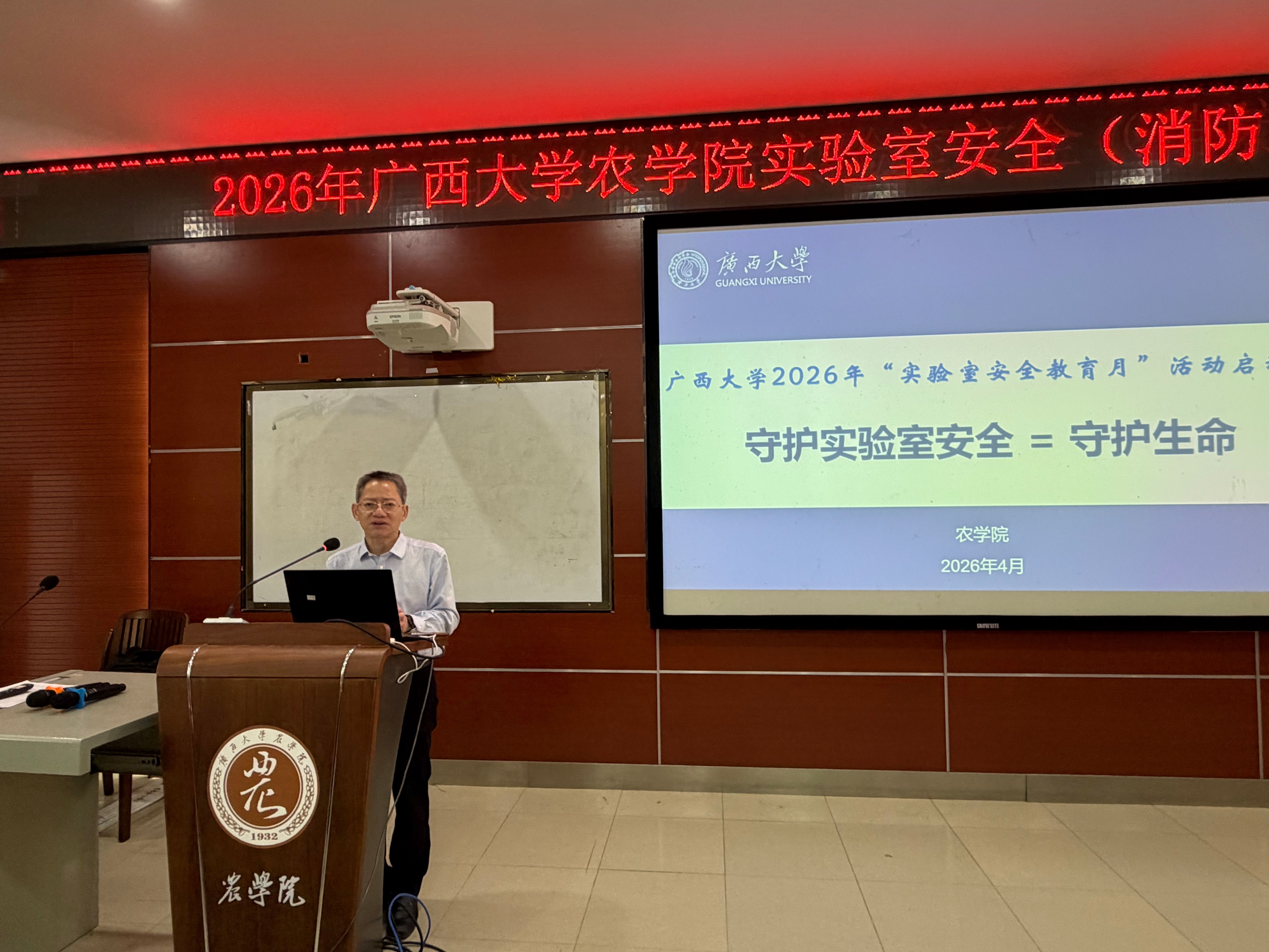 为深入落实学校 2026 年实验室安全教育月工作要求,牢固树立 “守护实验室安全,就是守护生命” 的安全理念,切实提升全院师生的安全意识与应急处置能力,4 月 3 日,农学院组织开展了实验室安全(消防)专题教育大会。学院党委书记袁涛、副书记高欲垚,副院长韦燕燕、杨艳琼出席活动,实验中心主任杨娟主持会议。