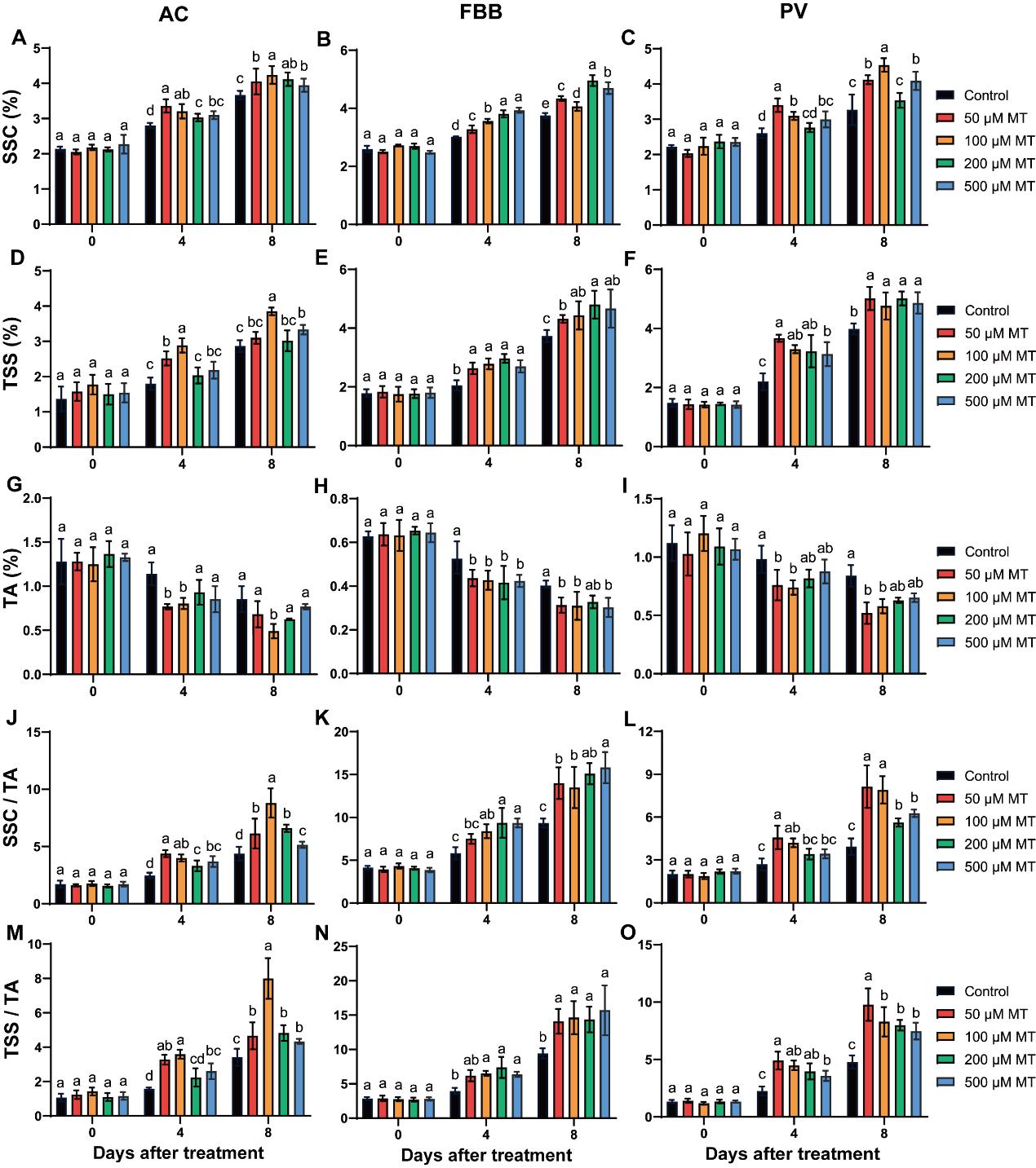 图3. 不同浓度褪黑素对采后AC、FBB和PV番茄果实总糖和酸含量的调控作用。A-C分别为AC、FBB和PV番茄果实的可溶性固形物含量(SSC);D-F分别为AC、FBB和PV番茄果实的总可溶性糖(TSS);G-I分别为AC、FBB和PV番茄果实的可滴定酸度(TA);J-L分别为AC、FBB和PV番茄果实的固酸比(SSC/TA);M-O分别为AC、FBB和PV番茄果实的糖酸比(TSS/TA)。数据表示为平均值±标准差。不同小写字母表示处理间存在显著差异(P<0.05)。